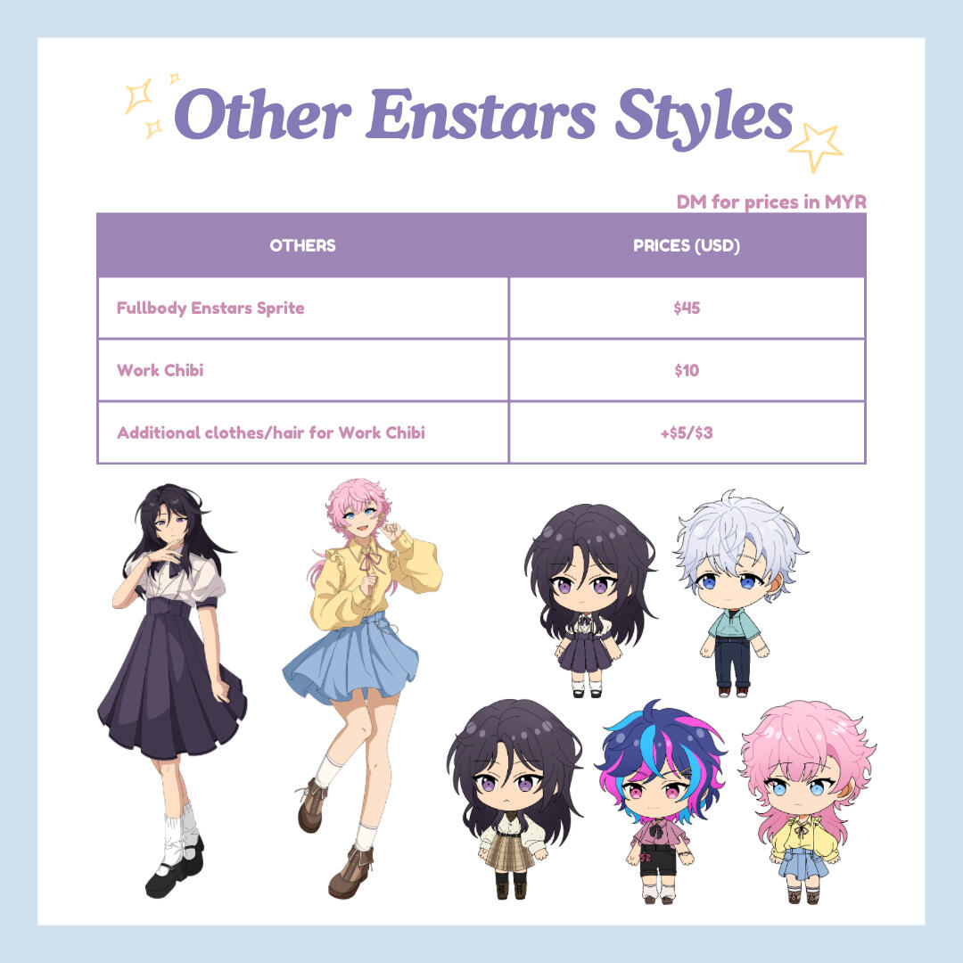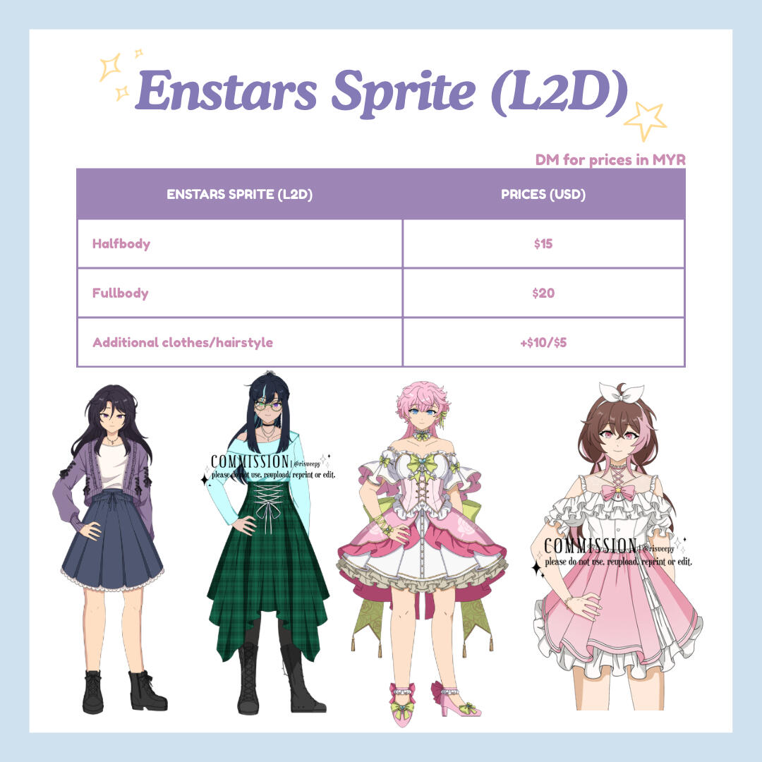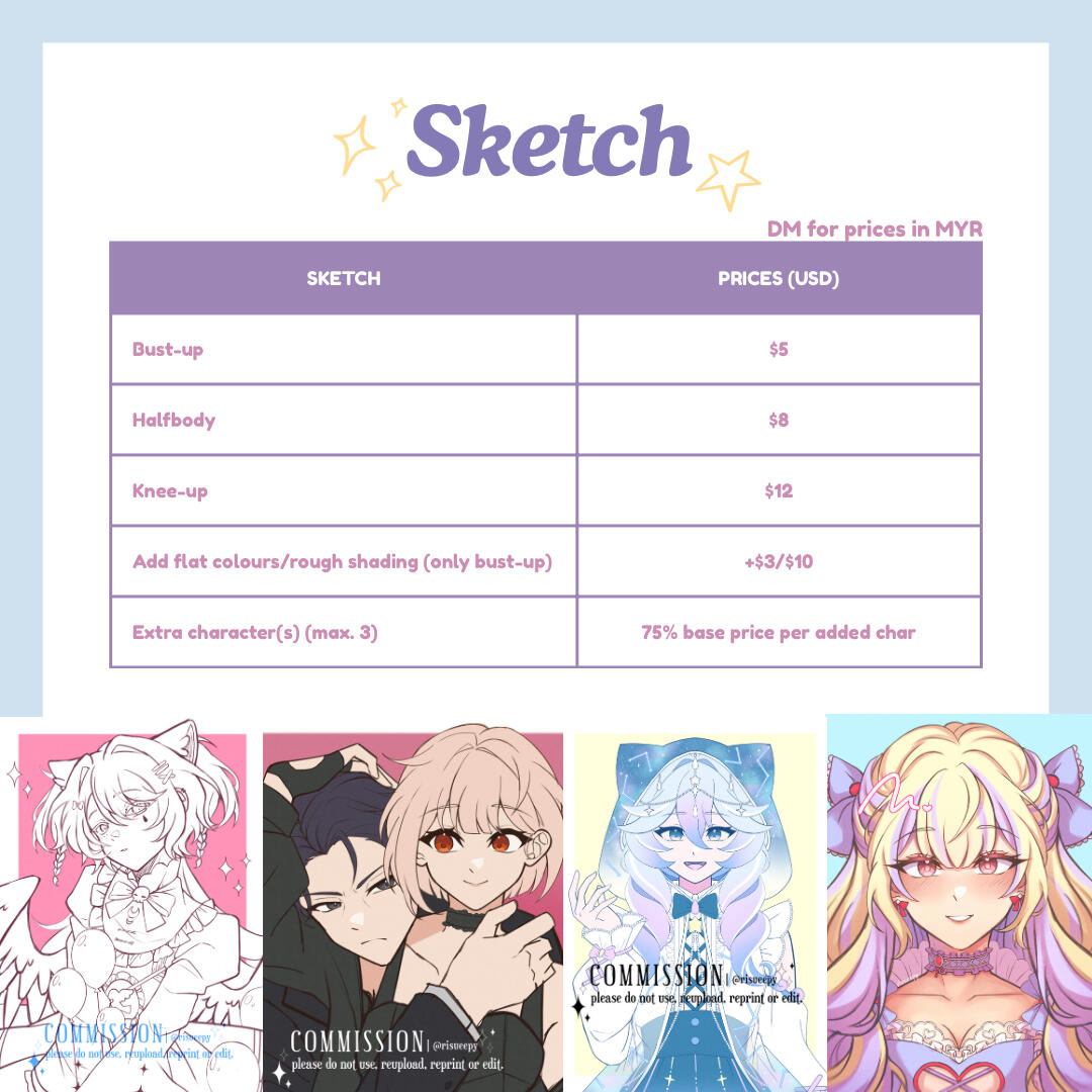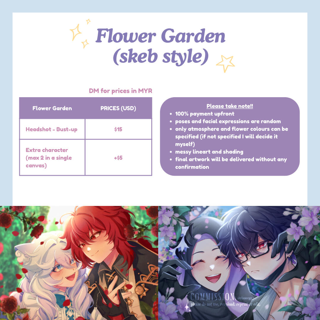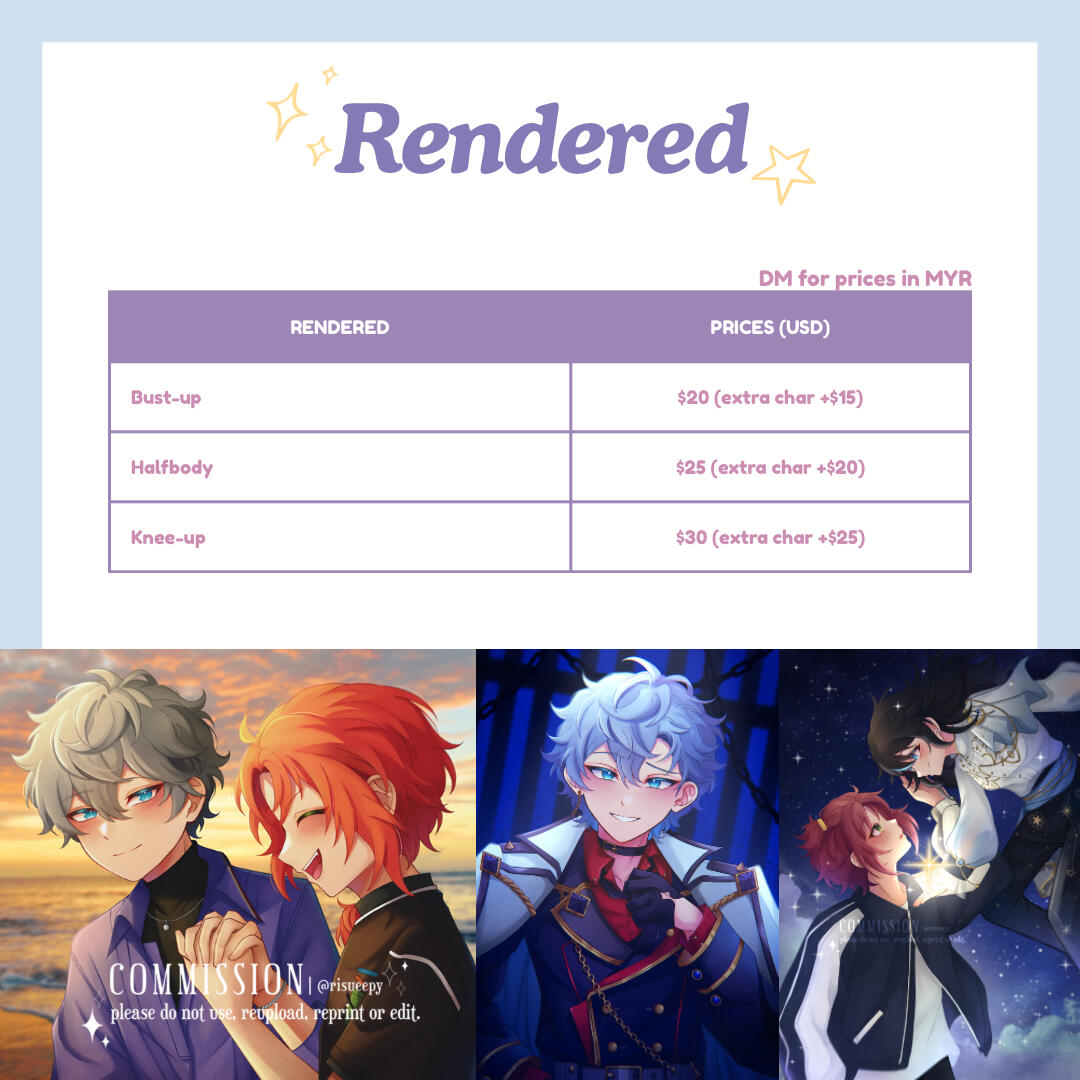 ✦ if you're in the wait-list and no longer want to commission me, please let me know (if there's no reply after 3 weeks i will remove you)disclaimer this is specifically for clients that wants to commission their yumeship with Izumi Sena and/or Leo Tsukinaga from Ensemble Stars. i'm able to draw your yumeship only if the pose/prompt isn't too romantic. i'm sorry in advance as it is just my boundaries and it makes me uncomfortable.do's ocs/yume/ocxcc/ccxcc, fanart, kemonomimi (ears/tails), mild gore (ex. blood splatter)don'ts nsfw, furries, gore, muscular, mecha, facial hair, old people, overly complex outfit designs, complex armor, complex bg/poseswhat i'll need character reference(s), pose reference(s), any extra info that you think might help me with your comm like personality, atmosphere/ambience, dynamics/height difference (if more than one character), etc.payment methods international: paypal, local: bank transfer, duitnow, tngprocess inquiry > confirmation > sketch > full payment > lineart > final deliverydelivery i will provide a google drive link with the full artwork and transparent version (you may also request to send via email)contact ty for reading this far! if you're interested you may send me a dm via twitter/instagram @risueepy (my twt dms are a bit buggy so i might not notice your dms straight away)